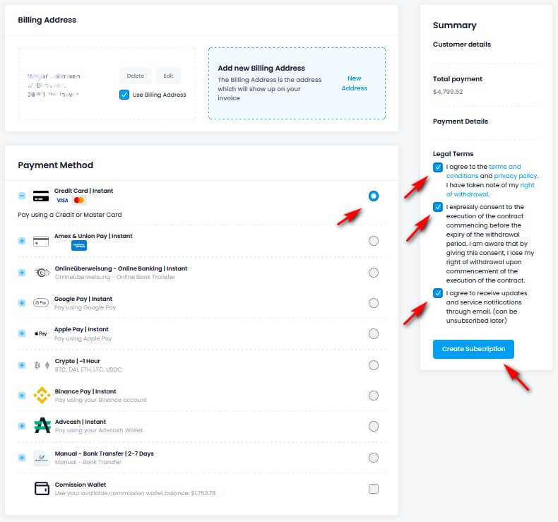 Wähle die gewünschte Zahlungsmethode, klicke die Häkchen rechts an und klicke "Create Subscription".